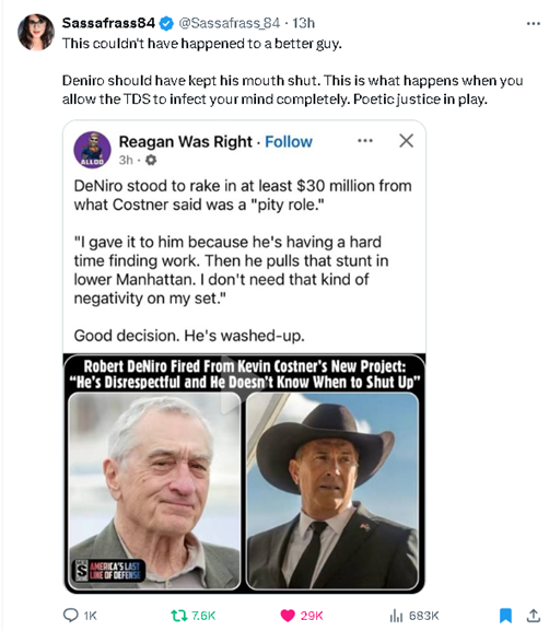 There has been other backlash against DeNiro, even a major loss of a lucrative role in a Kevin Costner production. Check out this post shared by @Sassafrass_84