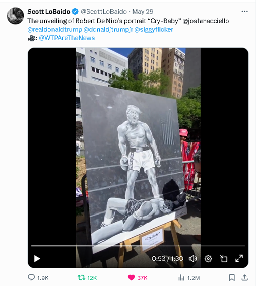 Perhaps this recent piece of art best depicts how patriots see Donald Trump and Robert DeNiro. Artist, Scott LoBaido recently unveiled his masterpiece entitled “Cry Baby.”