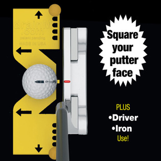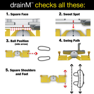 drainM is a pocket-sized alignment aid that helps square the face for putting and drivers and irons. It's easy to use and perfect for golfers to train their minds and eyes to square the club face. It also creates a sweet spot that can be dialed in with tees.