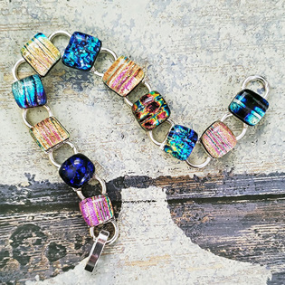 With that said, the creation of each piece of jewelry is painstakingly undertaken by the artist from start to finish. The process of creating each piece starts by choosing all glass colors and textures, placing the pieces into a formal design, covering the design with clear glass, and then fusing it in the kiln. The next day each piece is cut and ground into the desired shapes. Hours later, the pieces fuse again in the kiln and come out shiny and smooth. All are unique.