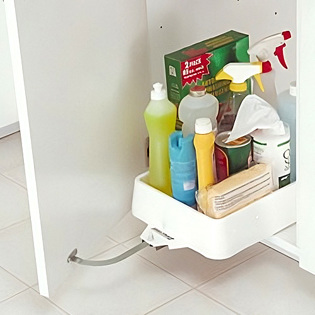 The SHELFMAID® Wastebasket Tray is designed to provide easy access to items stored in a cabinet that requires constant access. SHELFMAID® is ideal for those who like to store their wastebasket in an under-sink cabinet. SHELFMAID® will slide out of the cabinet as the door opens and slide back in as it closes, alleviating having to pull items out to access them.